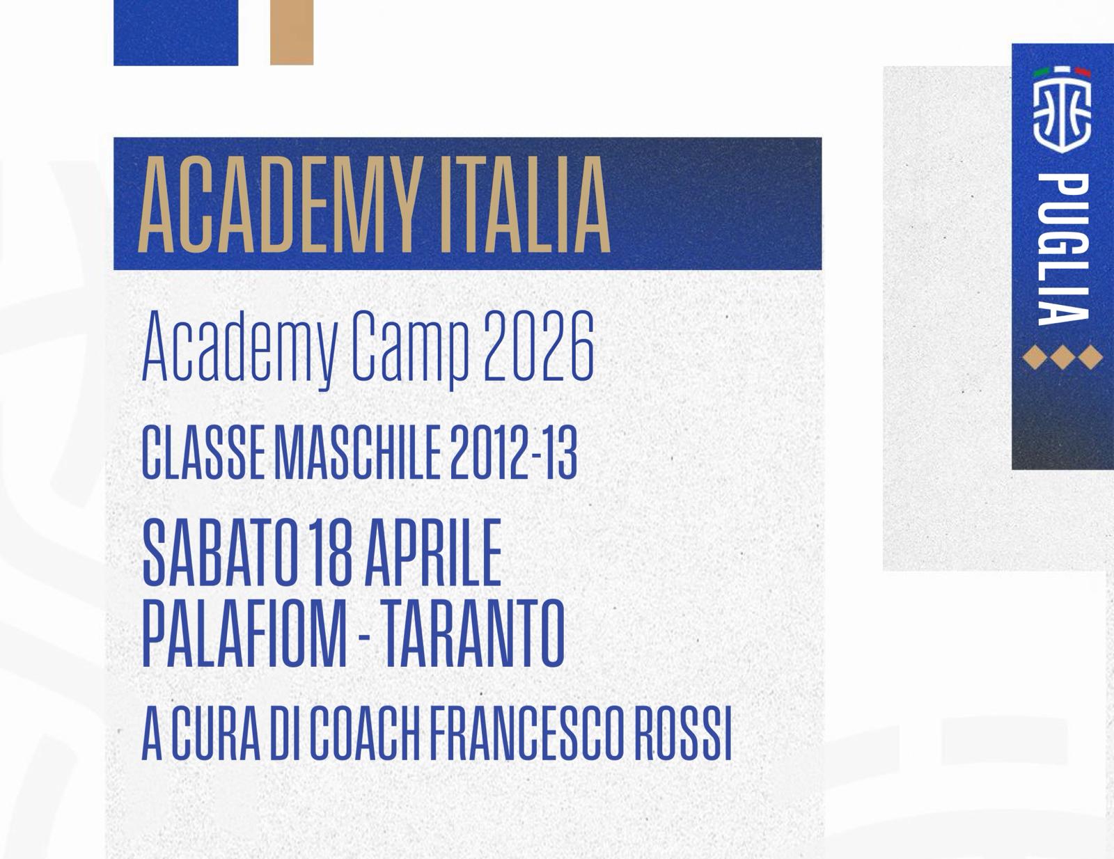 Sabato pugliese per il progetto Academy Italia, l’iniziativa di reclutamento della Federazione Italiana Pallacanestro. Appuntamento domani al PalaFiom di Taranto dove 48 cestisti delle classi maschili 2012 e 2013 si alleneranno con Francesco Rossi, tecnico del Settore Squadre Nazionali. Due gli allenamenti in programma: prima seduta alle 16,45 (raduno alle 16,15), seconda alle 18,30 (raduno alle 18).